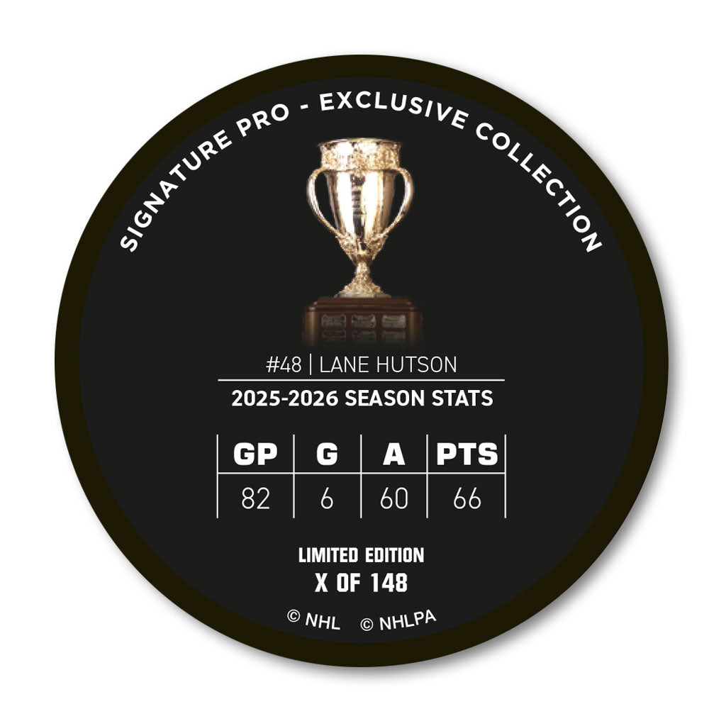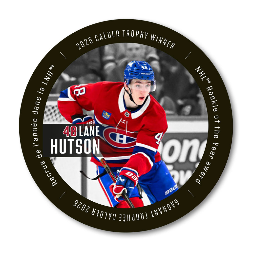 This is a Lane Hutson Montreal Canadiens 2025 Calder Trophy Winner Hockey Puck Limited Edition of 148 In Display Case.